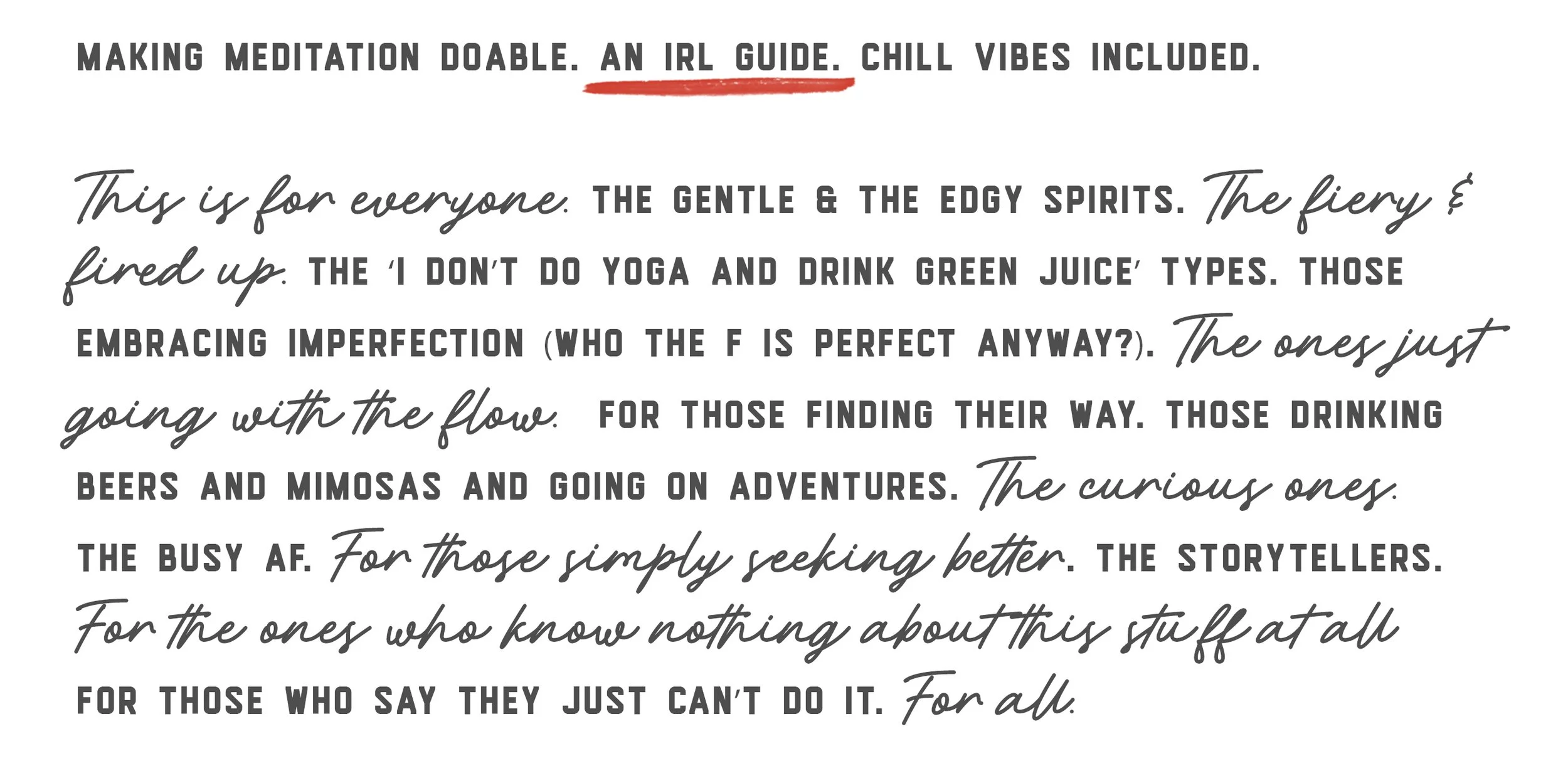 Apps and classes are totally cool, and often a part of the 'life toolbox' and used as needed. Should you choose to the one-on-one route with a real-life guide, in our first session, we’ll get to know one another to tailor the experience just for you and your life in a safe & private space. The goal is to integrate modern meditation techniques into your personal routine. To get there, this could mean a single session or a series. Everyone is different and we’ll create a practise plan to make meditation doable for you.